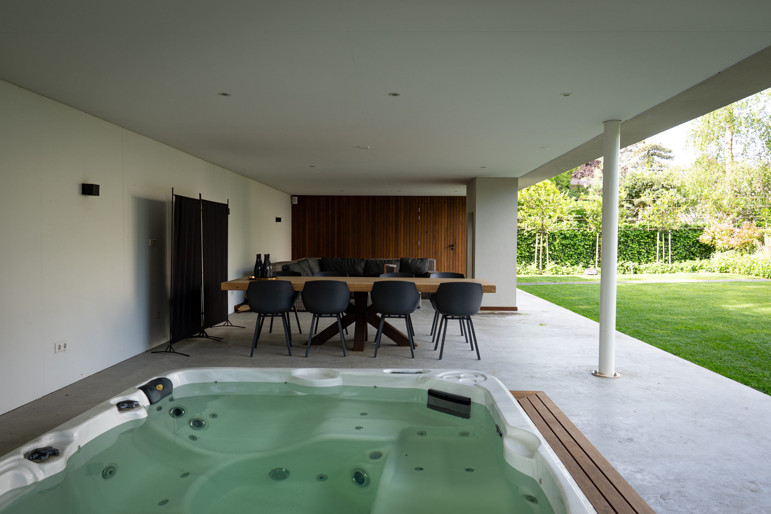 De veranda is uitgerust met een verdiepte jacuzzi, een ruime eettafel om samen te dineren en een knusse loungehoek met open haard. Alles is tot in detail ontworpen en afgewerkt, volledig afgestemd op het leven dat hier wordt geleid.