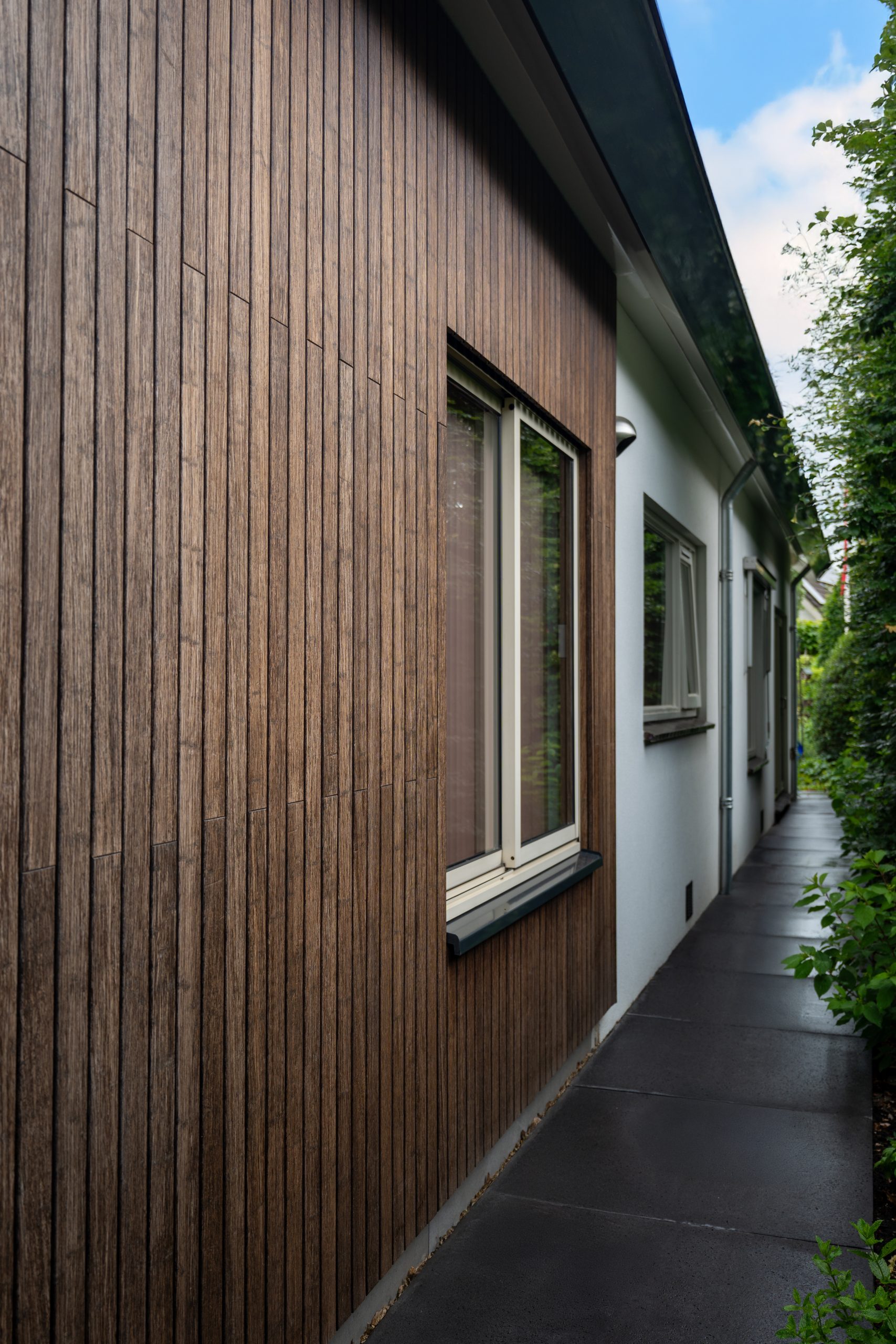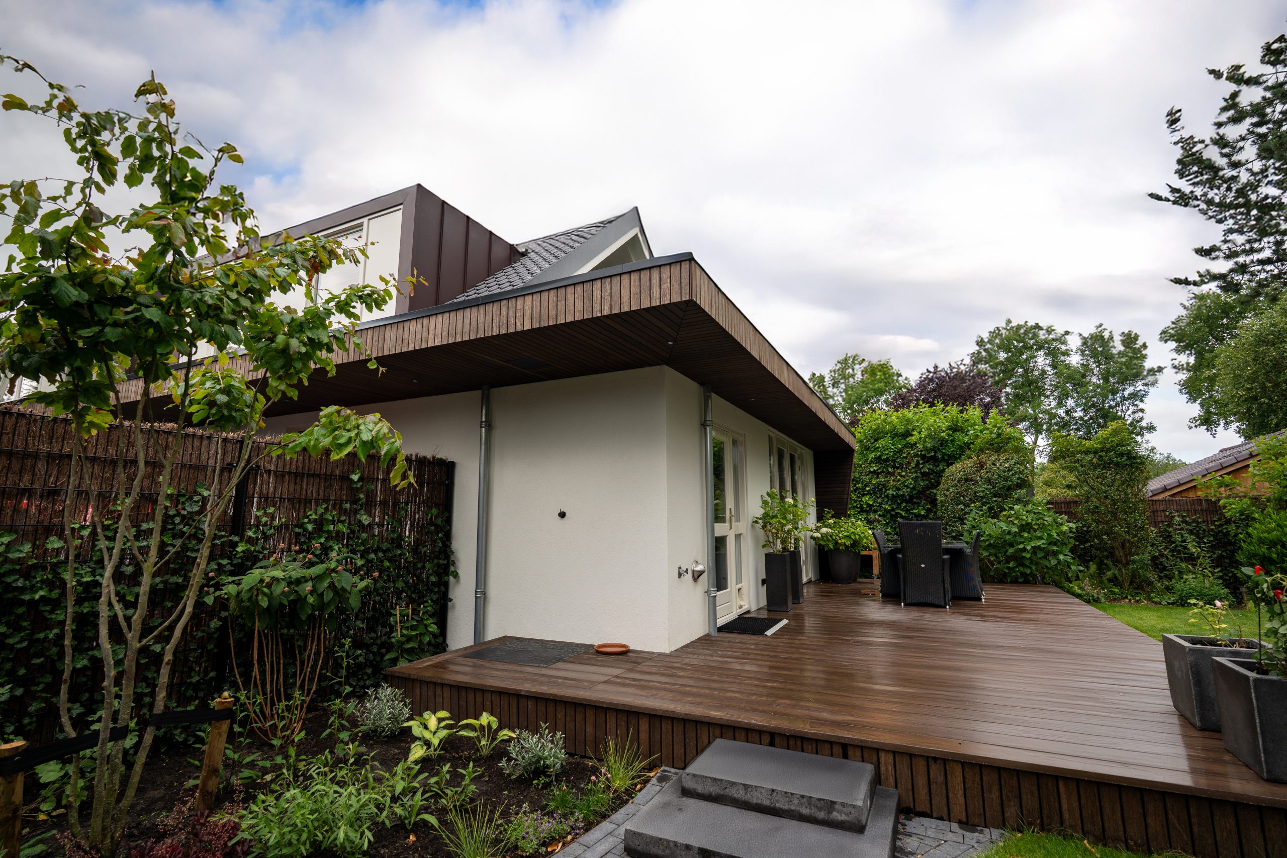 In de tuin realiseerden wij een garage met aangrenzende veranda, bekleed met bamboe gevelbekleding. Deze sluit naadloos aan bij de nieuwe luifel aan de woning, waardoor een harmonieus geheel ontstaat. Ook de bovenverdieping is volledig vernieuwd: de kap is voorzien van een lang dakkapel met zinken bekleding, wat extra ruimte creëert en de woning een moderne uitstraling geeft.