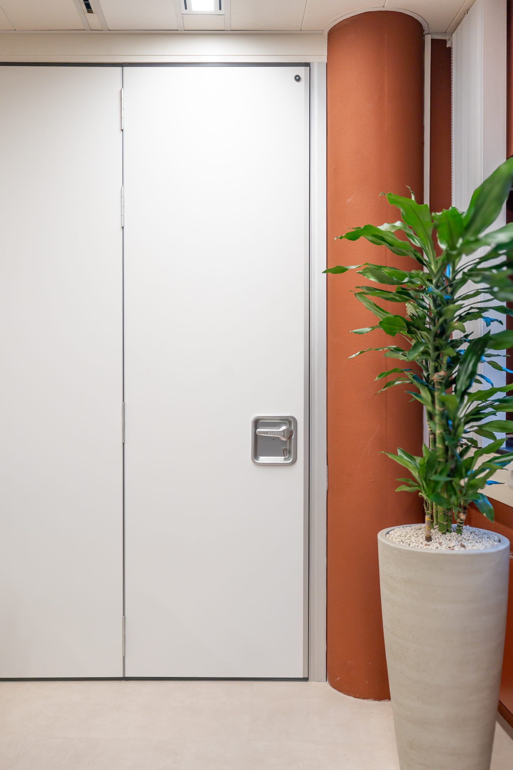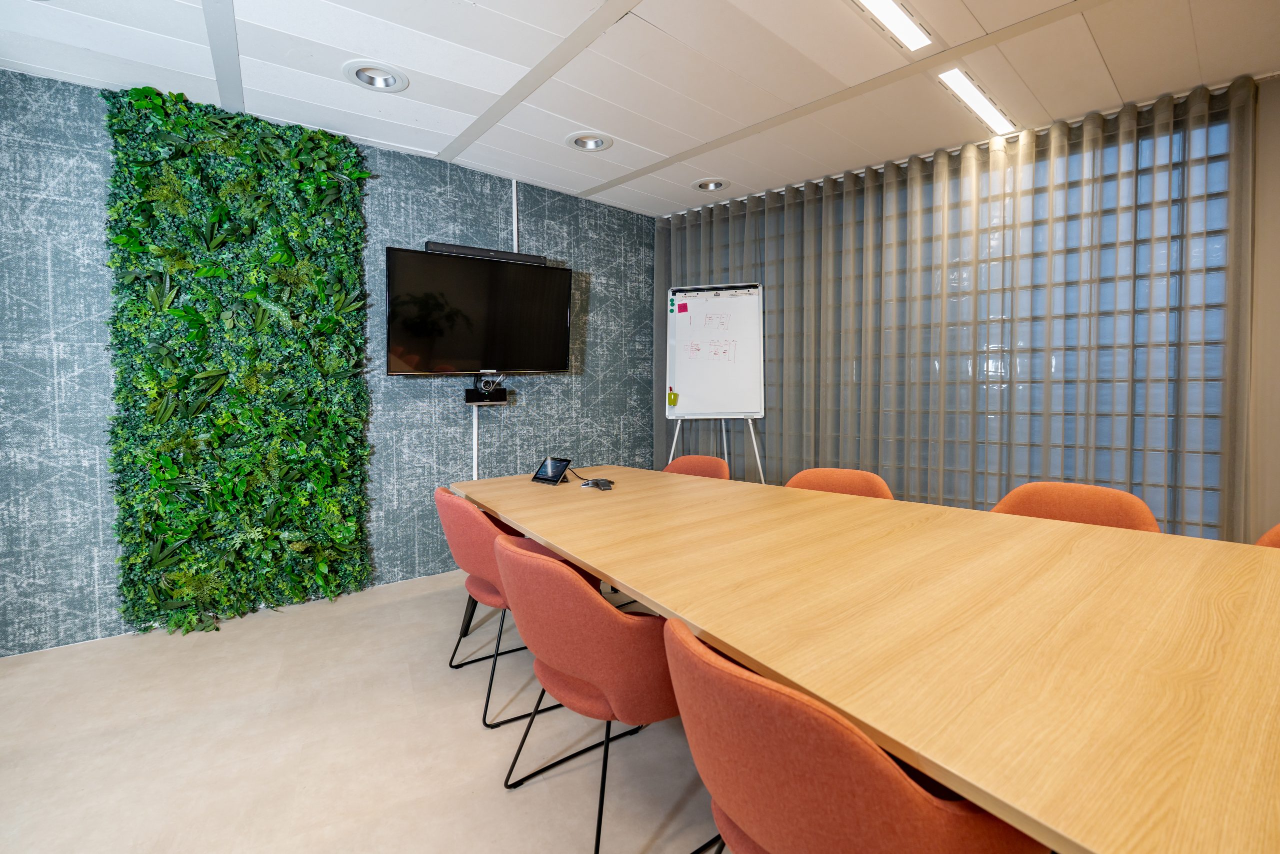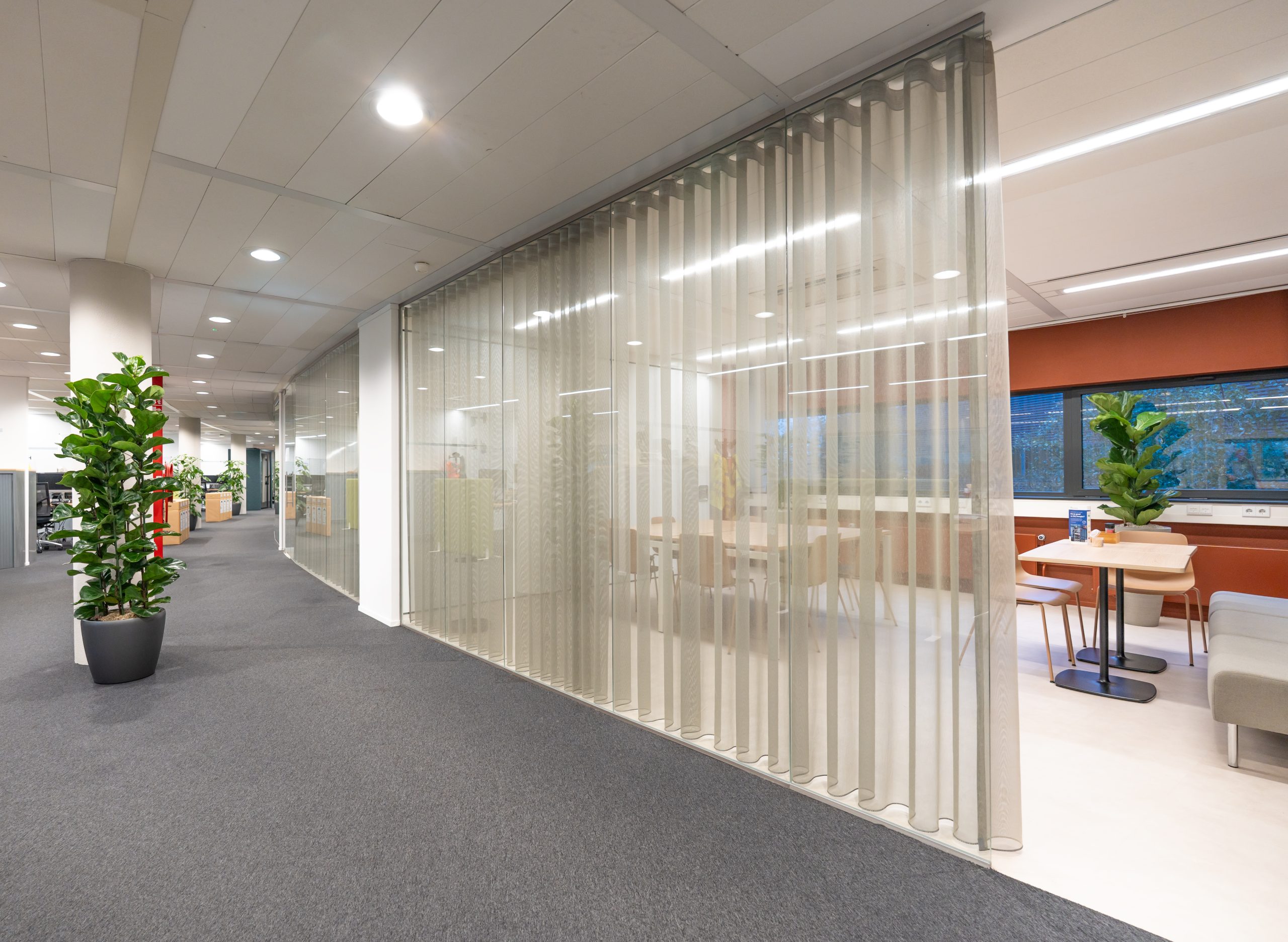 De vernieuwde indeling bestaat uit lichte kantoorunits met royale glaspartijen en een eigentijdse kleurstelling. Tussen twee ruimtes is een stijlvolle vouwwand geplaatst, waardoor de afzonderlijke kantoren eenvoudig kunnen worden samengevoegd tot één ruime vergaderzaal. Het resultaat is een flexibele en toekomstbestendige werkomgeving die perfect aansluit op de moderne manier van werken.